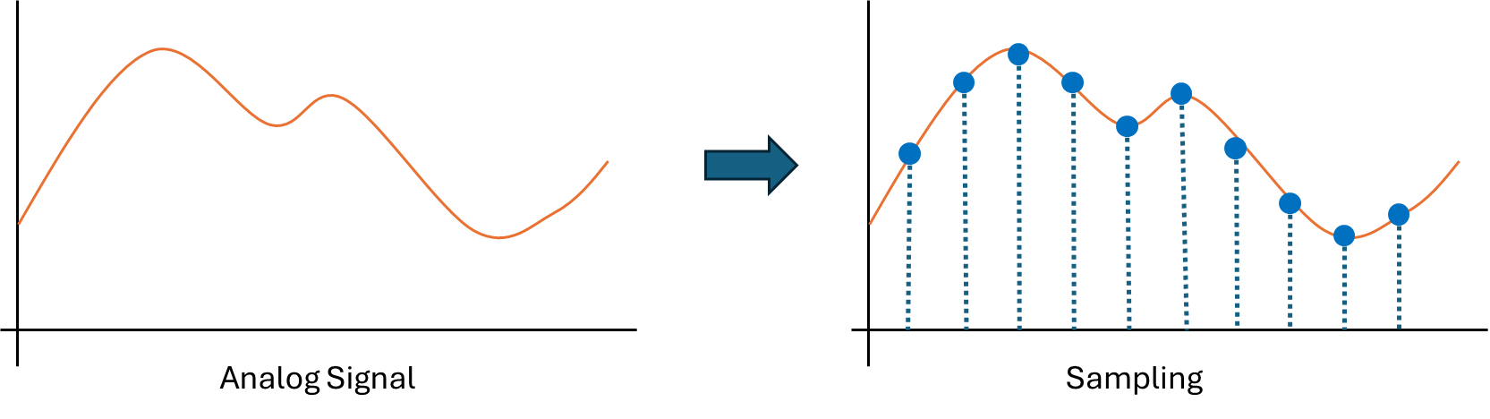 AD converting을 할 때, 연속적인 전기신호 모두를 Digital로 변환 할 수는 없습니다. 모든 자연수는 무한이기 때문이죠. 예를 들어 0부터 9는 정수로 1씩 증가하면 한정적이지만 소수점으로 들어가게되면 무한하기 때문입니다. 그래서 일정간격의단위로 Analog 신호를 선별해서 Digital로 변환하는 과정을 거치게 되는데 이것이 바로 샘플링(Sampling) 입니다.